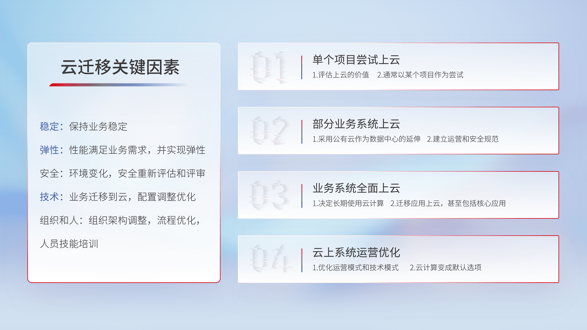 结合实际业务,,,,从规划设计、、云平台选型、、、、云原生改造、、数据迁移、、、、集成交付,,迁移全过程为客户识别最佳上云路径,,做好风险识别管理,,设计网络架构、、身份权限、、、、安全审计合规、、、操作审计、、、、日志审计、、、、监控告警策略、、、、多站点容灾设计等,,,,对云上基础设施进行整体规划,,,,提升IT治理水平,,,,以满足弹性、、、、高可用、、高性能的需求。。。