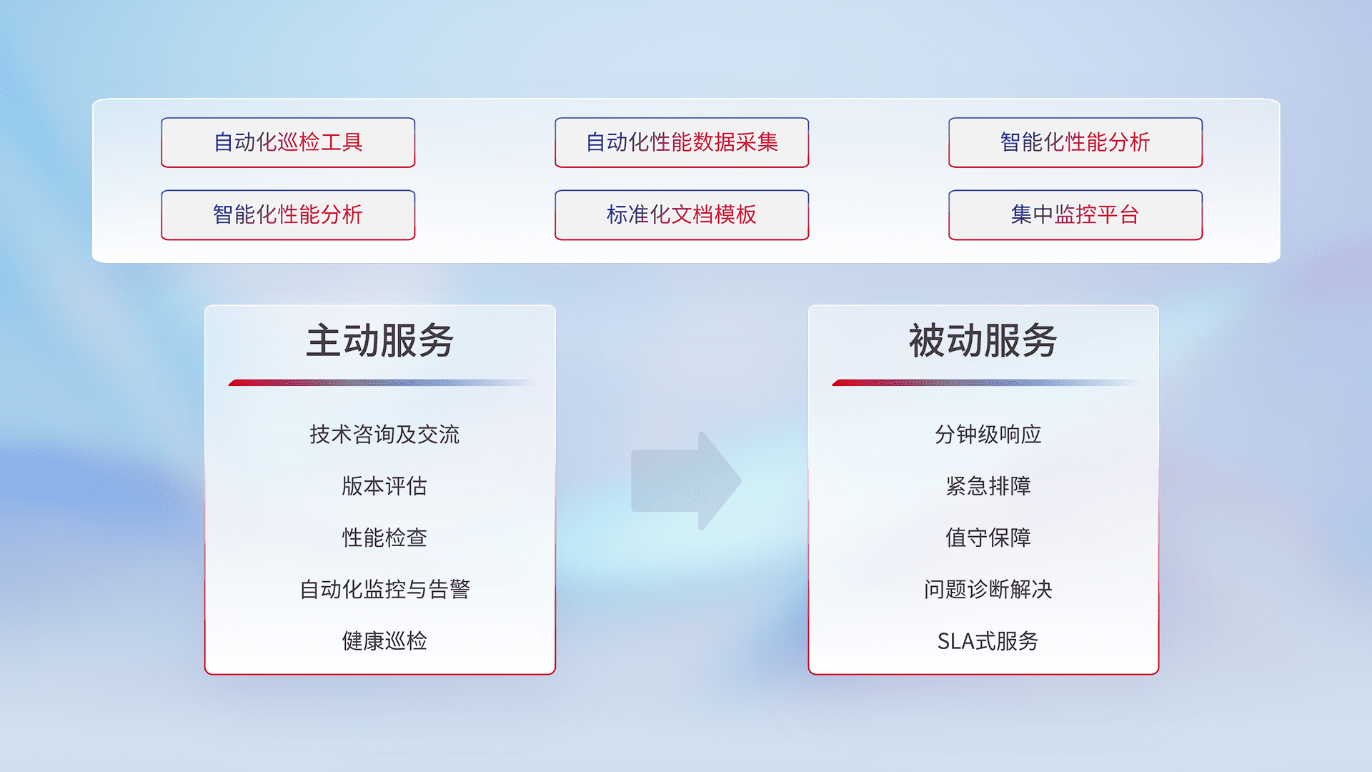 智能化工具和标准化文档,,,,保障服务质量,,,提供主动服务(包含技术咨询、、、、版本评估、、、、性能检查、、自动化监控与告警、、健康巡检)和被动服务包含(分钟级响应、、、紧急排障、、值守保障、、问题诊断解决、、、、SLA服务)。。。